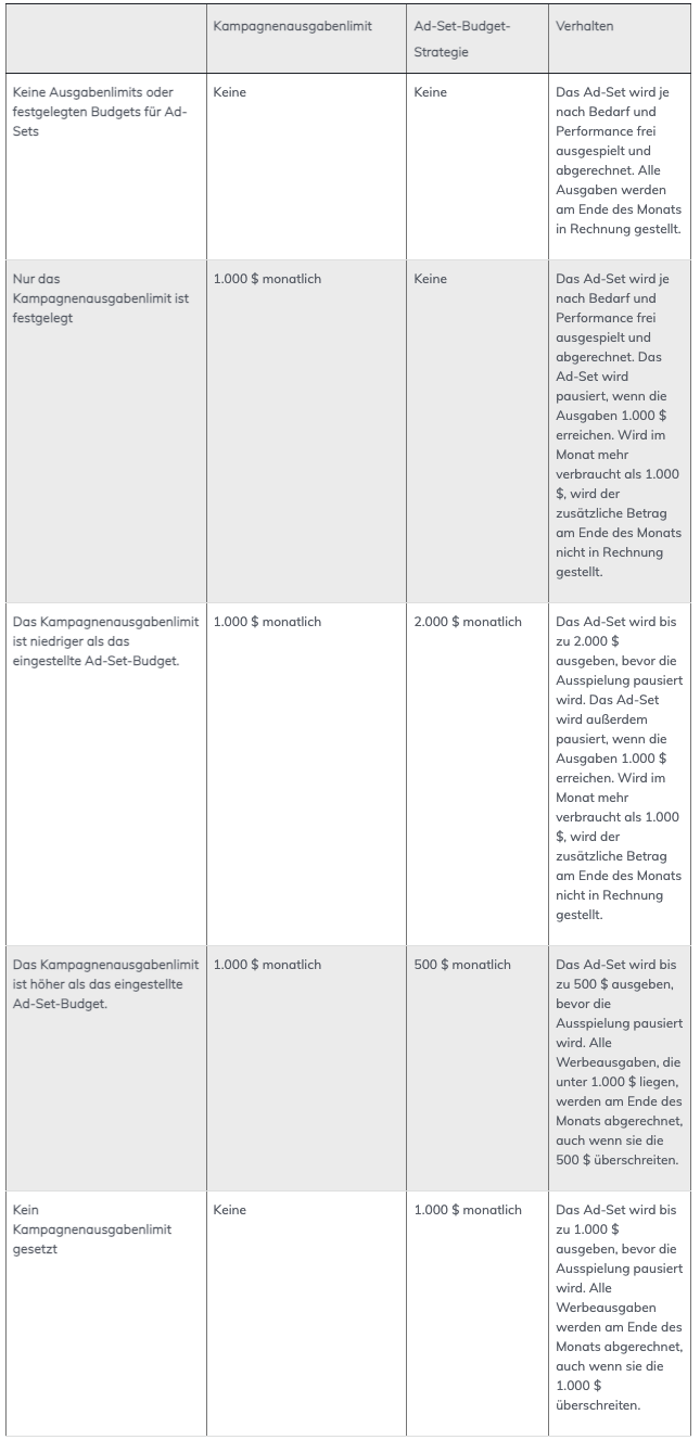 Ausgabenlimits erzwingen kein Pacing oder eine Aufteilung der Ausgaben zwischen Ad-Sets.