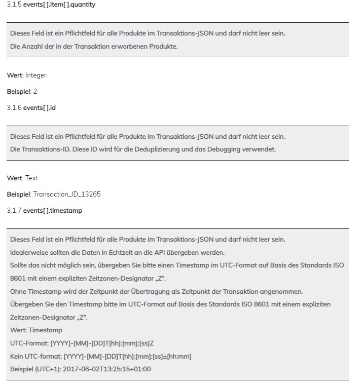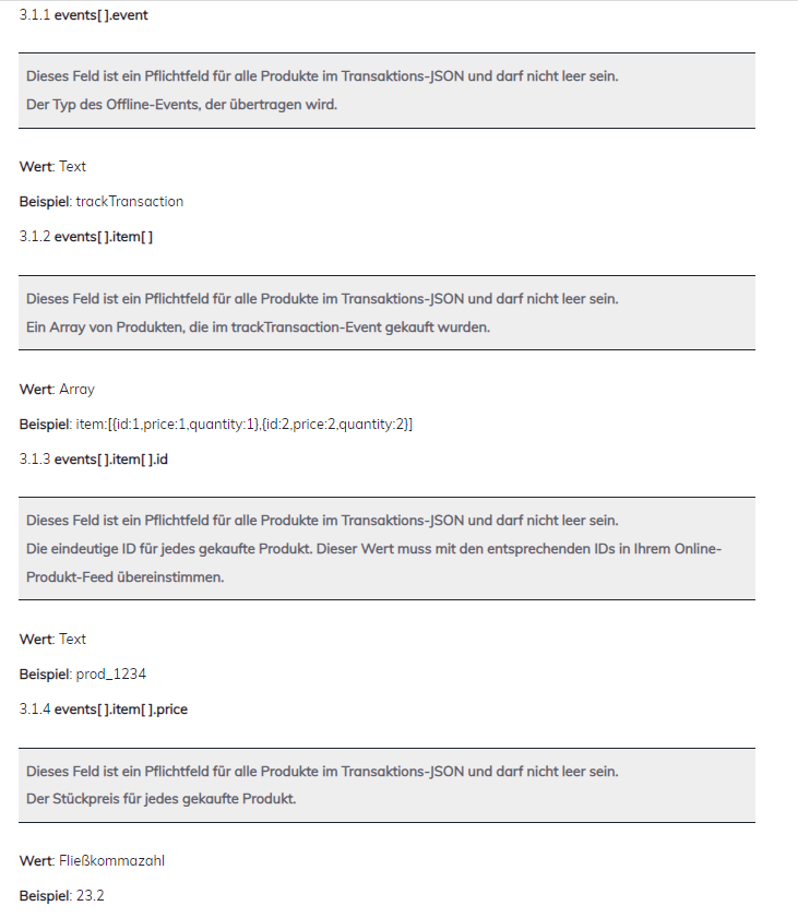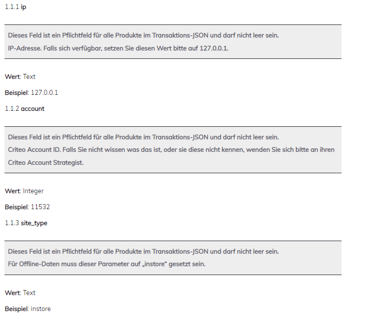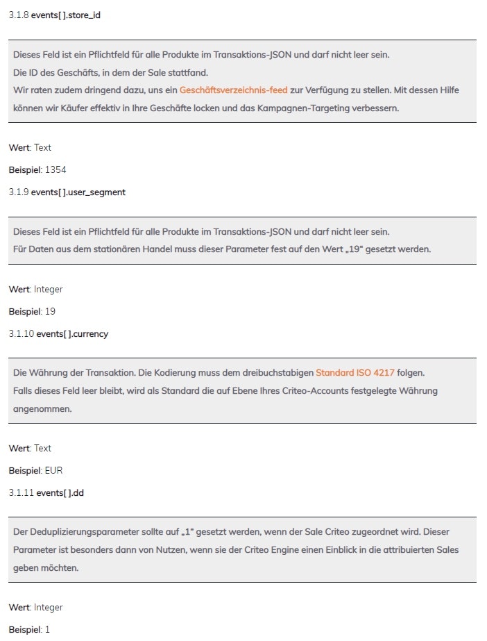 Nachstehend finden Sie den Satz von Parametern für die Transaktionsdaten, die im JSON Request Body übertragen werden müssen, um die Daten zu Ihren Offline-Sales an die Criteo Offline-API zu übergeben.