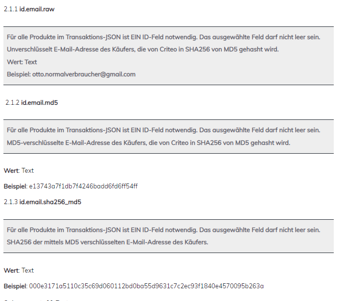Die E-Mail-Adressen werden im Criteo Identity Graph als SHA256 eines MD5 verarbeitet. Sollten Sie die E-Mail-Adressen nicht in diesem Format zur Verfügung stellen können, übertragen Sie bitte unverschlüsselte oder mittels MD5 verschlüsselte E-Mail-Adressen. Diese werden dann in Echtzeit von Criteo gehasht, bevor sie verarbeitet werden.