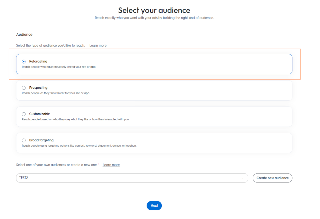 Target users who have already shown interest in your brand through previous website visits (retargeting), specific actions like adding items to cart (events), or existing customers from your database (contact list). This warm audience approach significantly increases conversion likelihood since these users are already familiar with your brand.