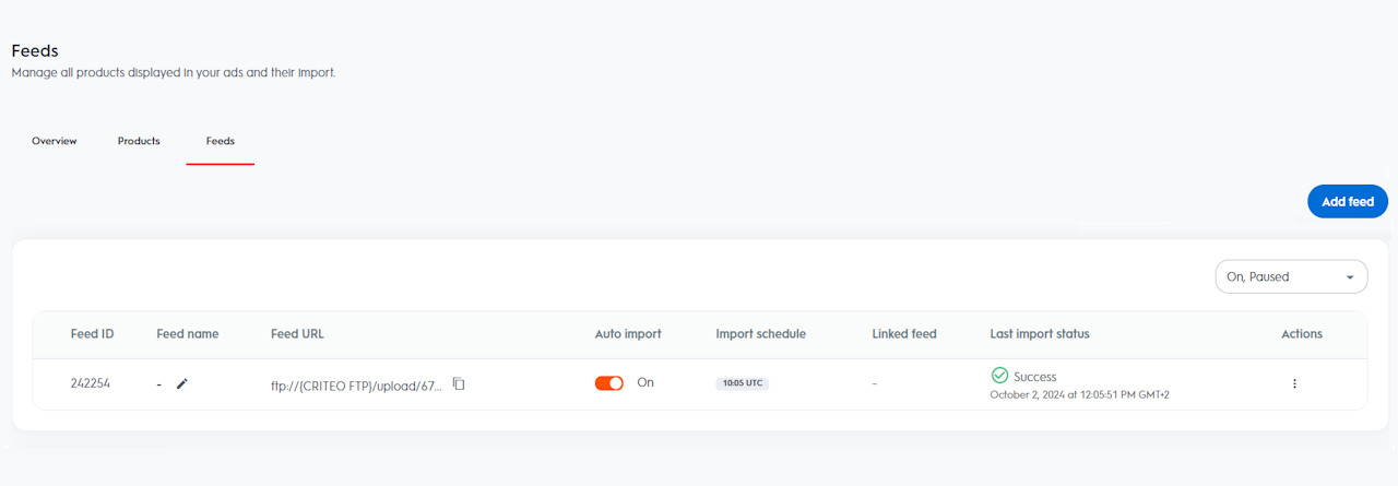 By default, feeds are set to Full Import, meaning the current feed being imported will replace the previously imported one. There are two other import types, which can only be set internally by Criteo if needed by the client: