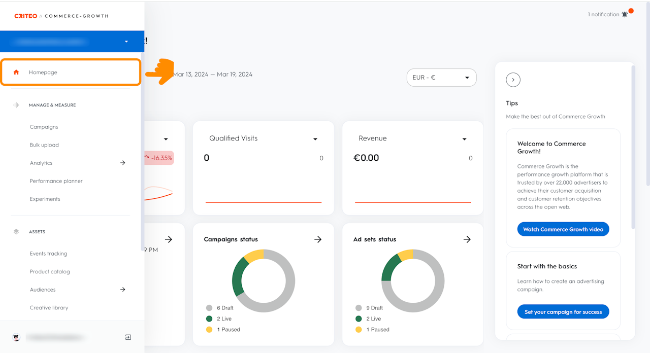 Within Homepage, you can see notifications and an overview of your campaigns and ad sets performance and navigate easily to Campaigns and Analytics.