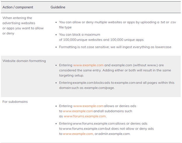 Below you will find formatting guidelines for allowing or denying websites or apps. Keep in mind that setting up allow or deny lists that are very narrow can limit reach and impact your ad set's ability to scale and spend in full.