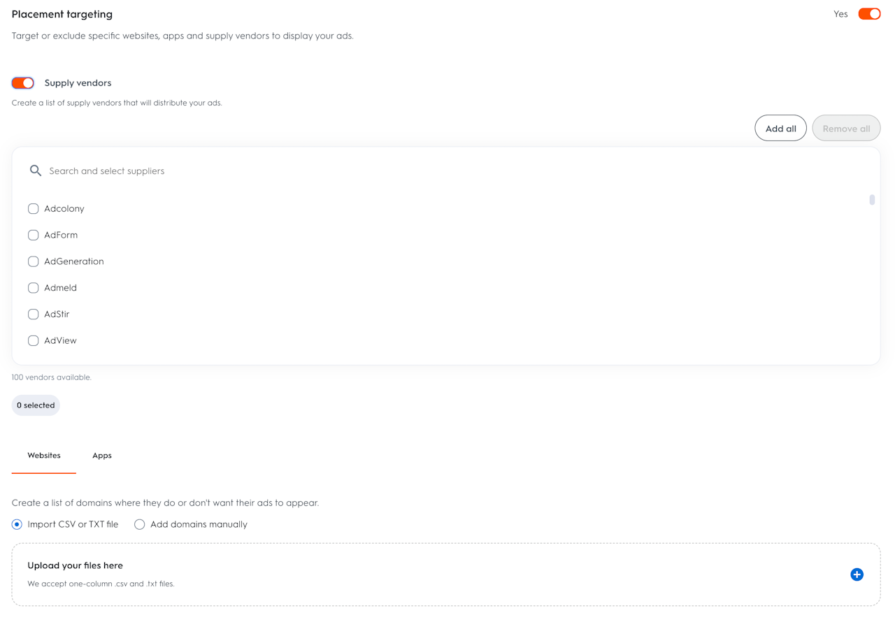 You can limit the supply vendors that will distribute your ads by activating the toggle and selecting the vendors on which you would like your ads to be displayed. By selecting Add all, you can easily then remove any specific vendors where you prefer not to display.