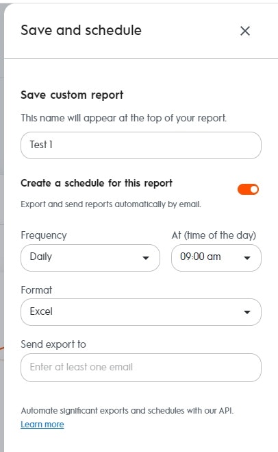 Reports can be scheduled daily, weekly, or monthly (sent on the first of the month) and are available as CSV or Excel files. You can name scheduled report, select the frequency of how often the report should be exported, choose a format, and enter the recipient’s email.