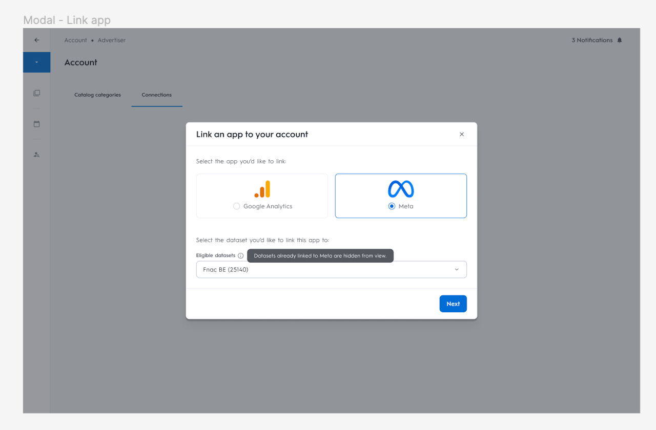 2. Click on Link an App and select Meta and the dataset you want to attach.