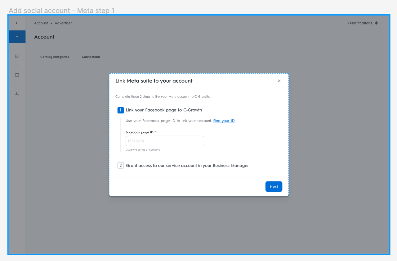 Now, if your Meta account is not successfully integrated with Commerce Growth, you will be prompted to set up the account. Otherwise, you will be directed to the activation flow where you need to create a social ad and set up your budget.