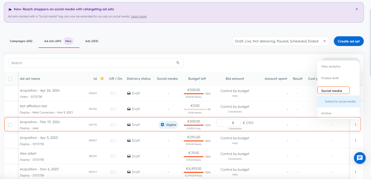 Click on the three dots of the eligible campaigns and select Extend to social media.