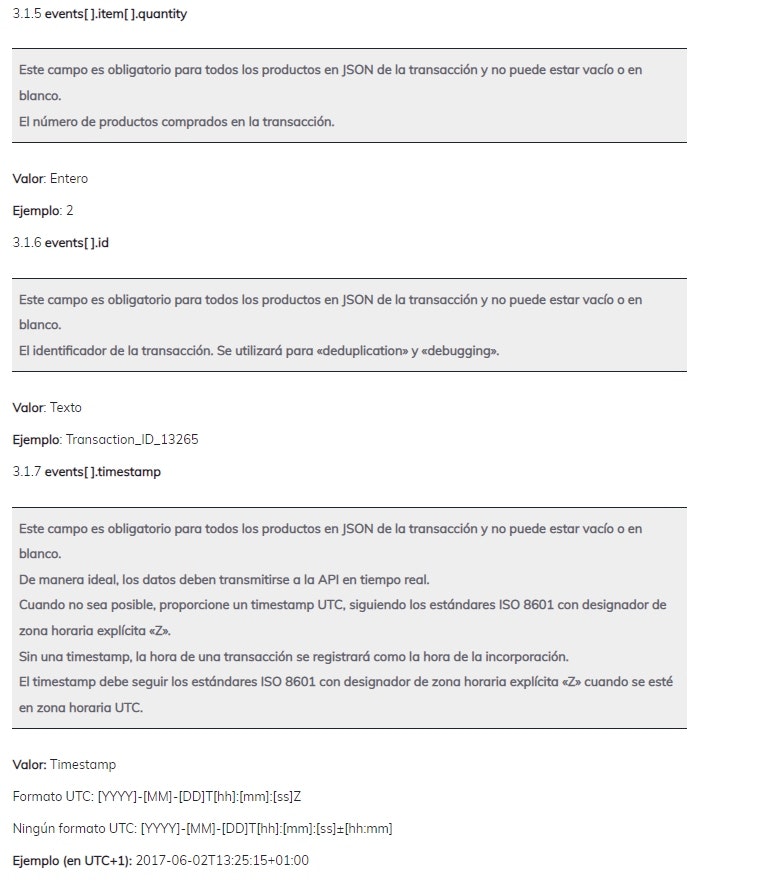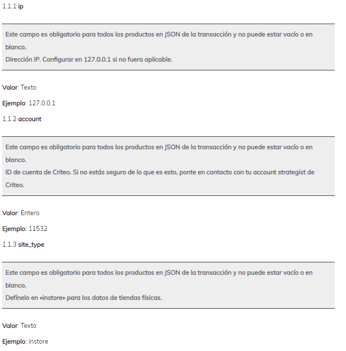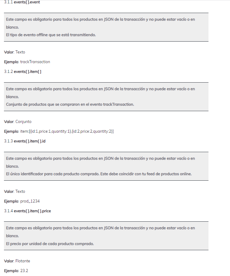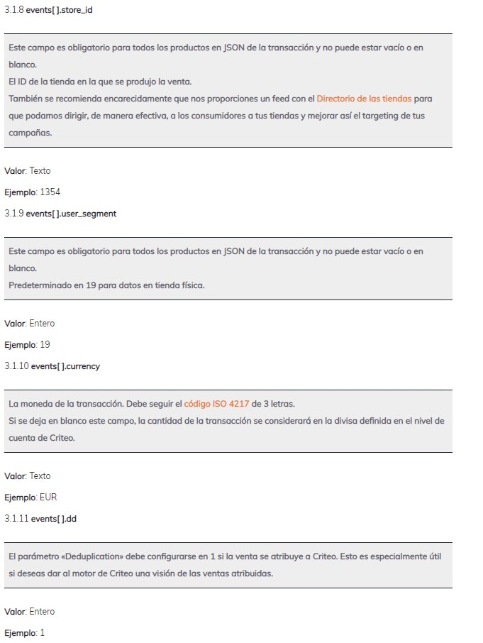 Consulta a continuación el conjunto de parámetros de datos de transacciones que deben proporcionarse en el cuerpo de la solicitud JSON para transmitir tus datos de ventas offline a la API offline de Criteo.