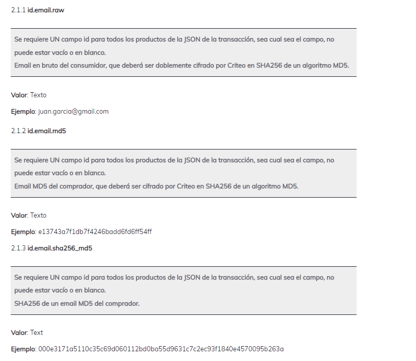 Los emails se incorporarán al gráfico de identidad de Criteo como SHA256 de un MD5. Si no puedes proporcionar los emails en este formato puedes proporcionar emails cifrados con algoritmo MD5 o en bruto, y Criteo se encargará de cifrarlos antes de incorporarlos.