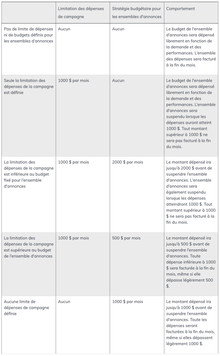 La limitation des dépenses d’une campagne s’applique à tous les ensembles d’annonces associés à la campagne. Les ensembles d'annonces seront suspendus dès que la totalité des dépenses aura atteint le montant spécifié.