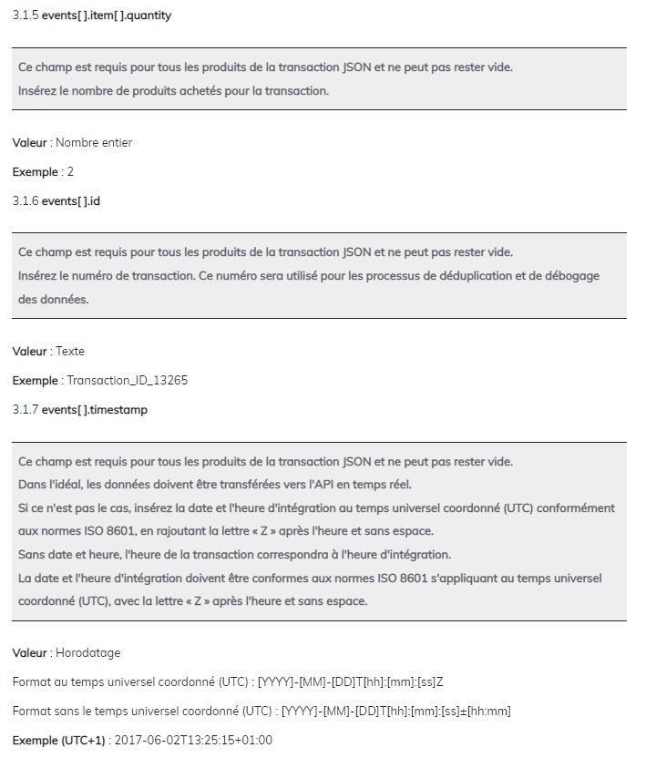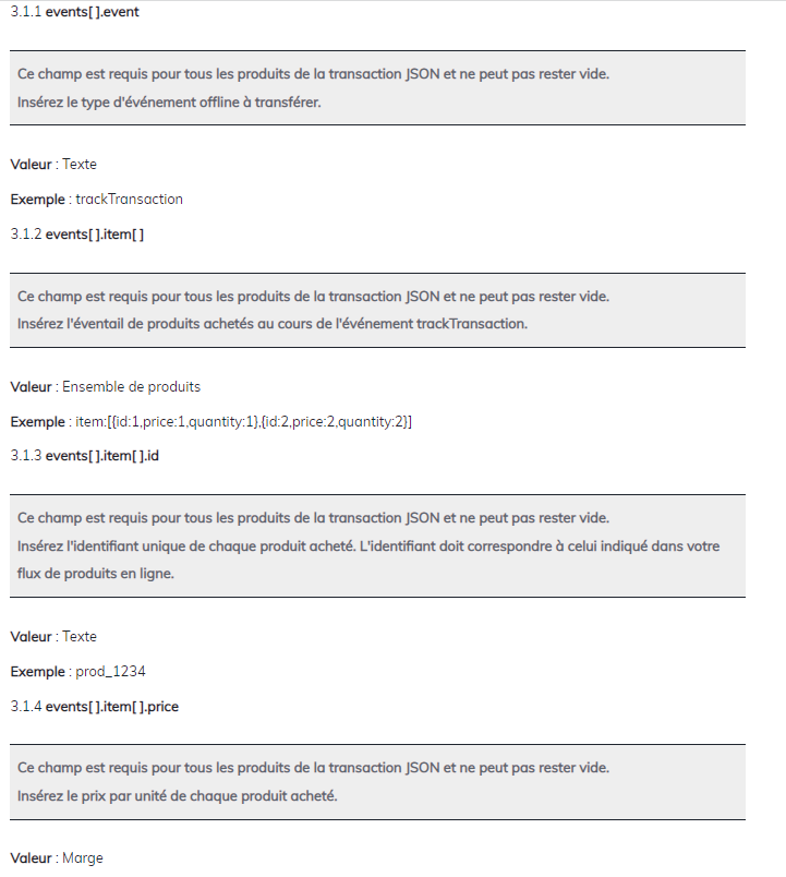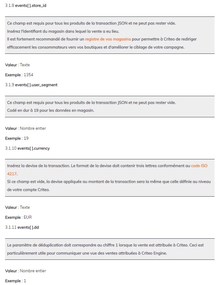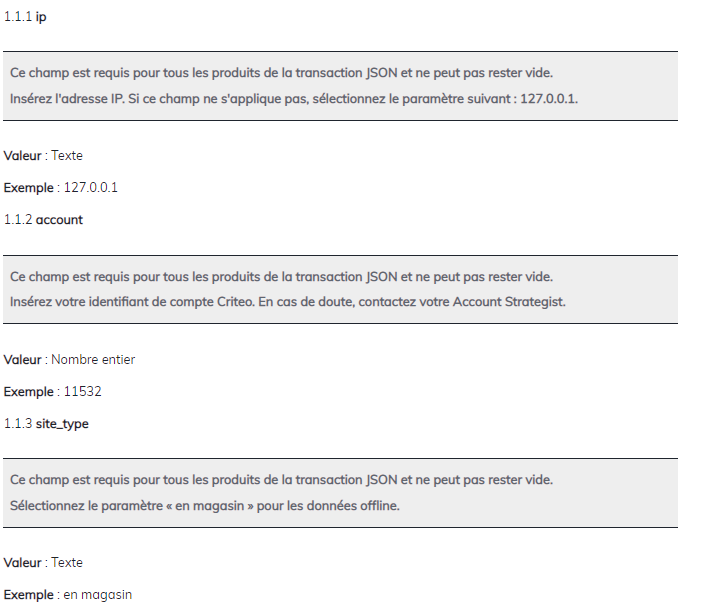 Vous trouverez ci-dessous la liste des paramètres de données transactionnelles requis pour envoyer une requête JSON et transférer vos données de ventes offline vers l'API offline de Criteo.