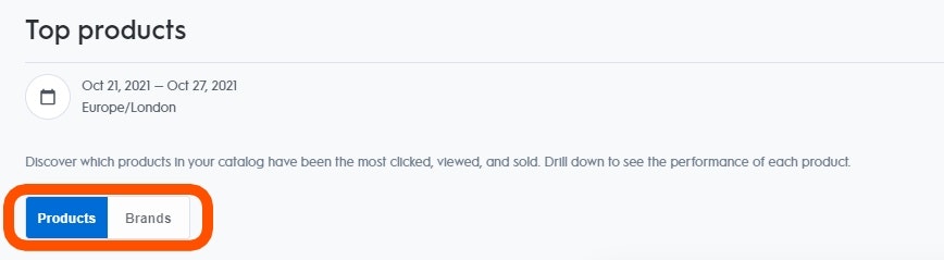 Le tableau de bord prend en considération les 1000 meilleurs produits affichés et tous les produits cliqués et vendus. L'objectif du tableau de bord est de vous guider sur votre catalogue. Les produits ou les marques avec moins de ventes peuvent générer du trafic vers vos produits les plus vendus. Nous vous déconseillons d'utiliser le tableau de bord comme guide pour prendre des décisions sur vos campagnes et ensembles de publicités.