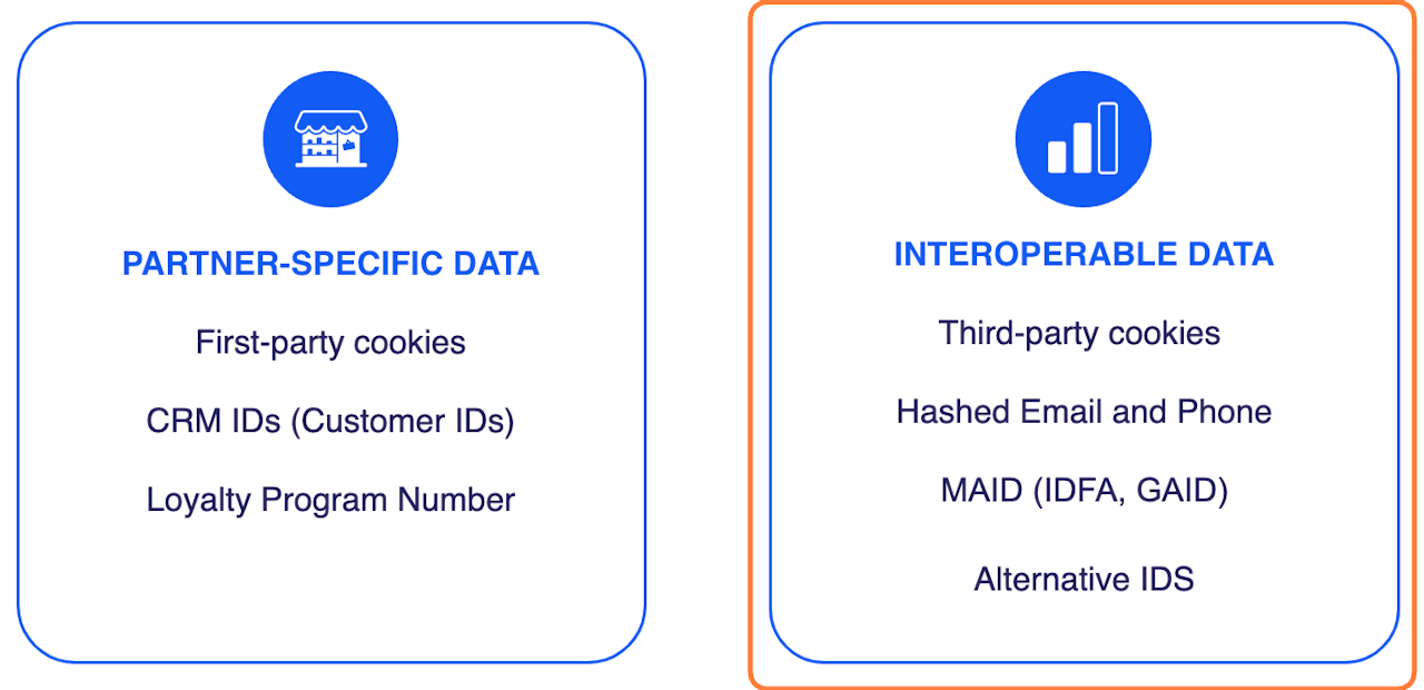 Dati interoperabili: dati che possono essere compresi da chiunque nel settore. I third-party cookie sono esempi di dati interoperabili. Con l'abbandono dei third-party cookie, Criteo e molti altri operatori del settore stanno passando a nuove forme di interoperabilità, come le email con hashing o altri ID alternativi deterministici e probabilistici.