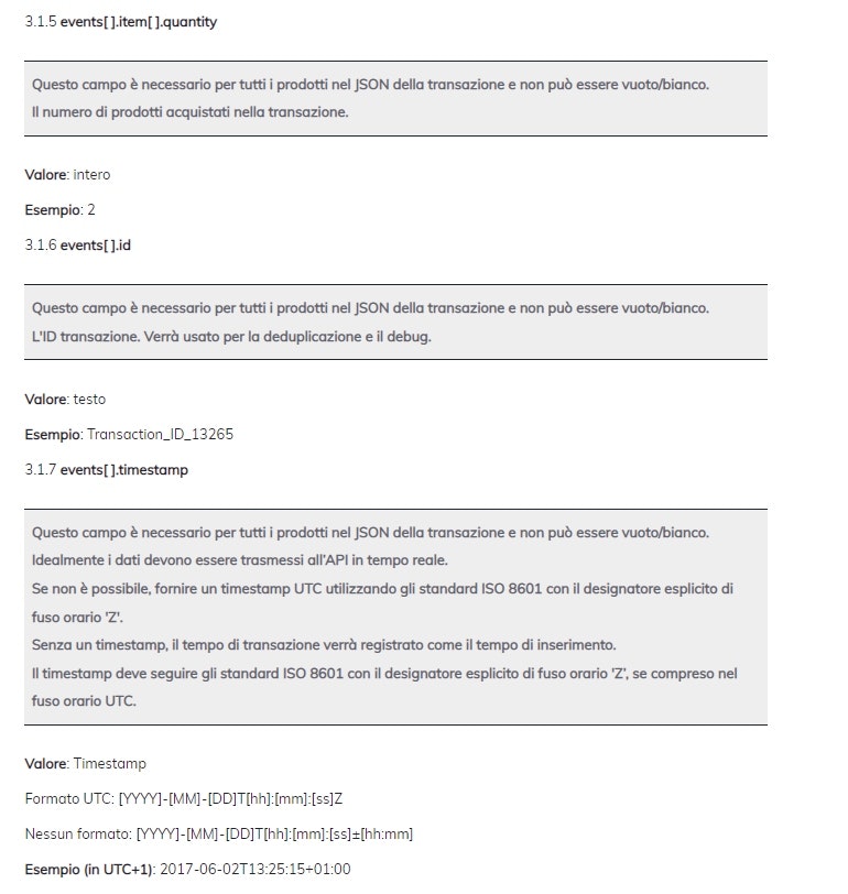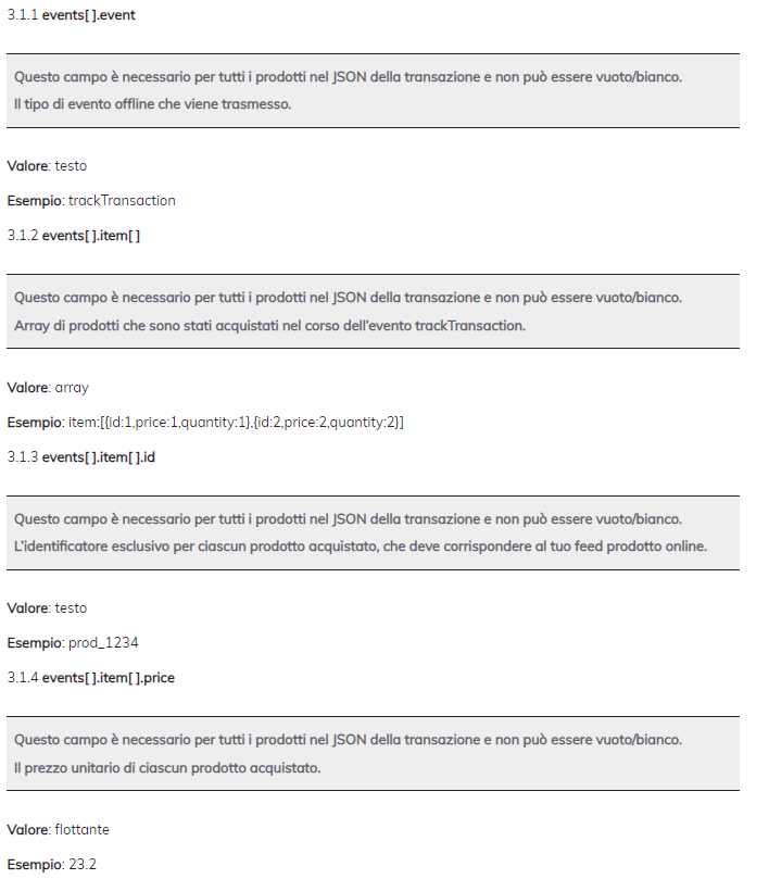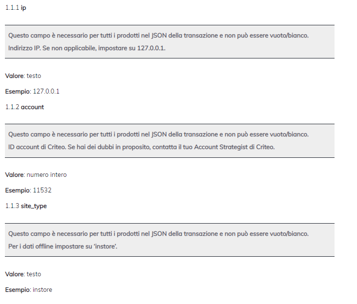 Di seguito puoi vedere il gruppo di parametri di transazione dati che devono essere forniti nel corpo della richiesta JSON allo scopo di trasmettere i tuoi dati sulle vendite offline al Criteo Offline API.