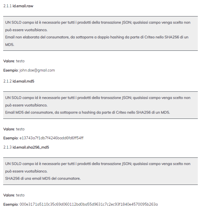 Le email saranno inserite nell’identity graph di Criteo come SHA256 di un MD5. Se non riesci a fornire email con questo formato, puoi fornirle non elaborate o criptate con MD5, che Criteo sottoporrà a hashing al momento, prima di essere inserite.
