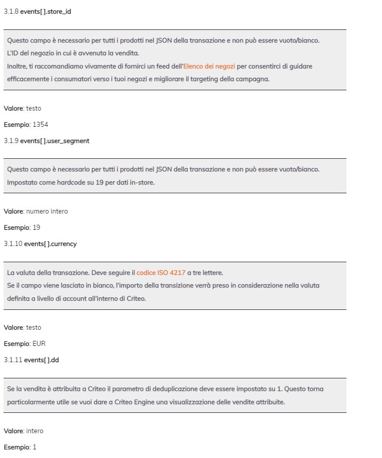 Di seguito puoi vedere il gruppo di parametri di transazione dati che devono essere forniti nel corpo della richiesta JSON allo scopo di trasmettere i tuoi dati sulle vendite offline al Criteo Offline API.