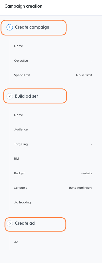 キャンペーンはオーディエンスへの広告配信に使用するフレームワークです。広告は「広告セット」と呼ばれるグループに分類され、この広告セットで配信の方法と配信対象のオーディエンスを定義します。1つのキャンペーンで複数の広告セットを使用することができ、広告セットごとに多数の広告が含まれますが、まずはそれぞれ1つから開始するだけで十分です。