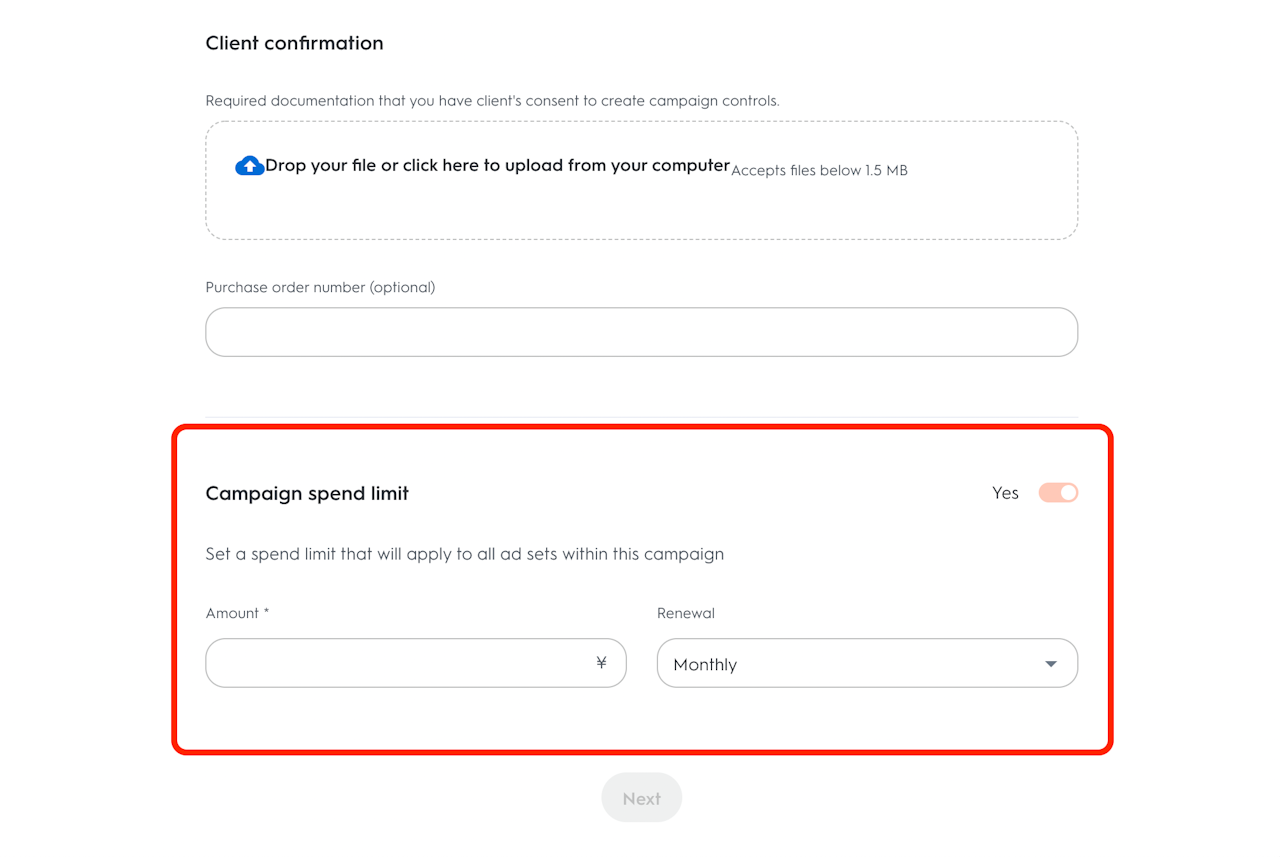 「支出上限」には、特定のキャンペーンで支払い可能な請求額の上限を設定します。 現在の段階でこの設定はオプションですが、支出を制限したい場合は、支出上限と更新頻度(デイリー、マンスリー、ライフタイム)を設定できます。
