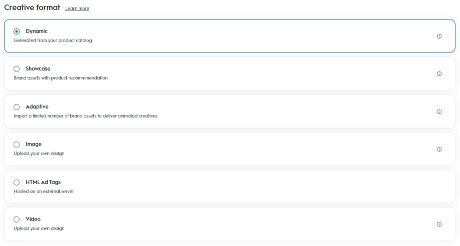 それぞれの広告フォーマットには特徴があります。動的広告を使用する場合は、このステップの前に製品カタログを完全に設定する必要があります.