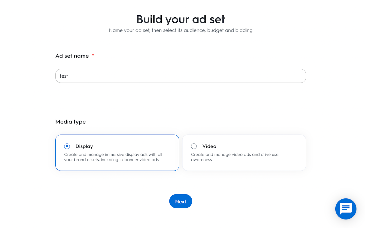 広告セットに名前を付けて、そのメディア タイプを選択します。