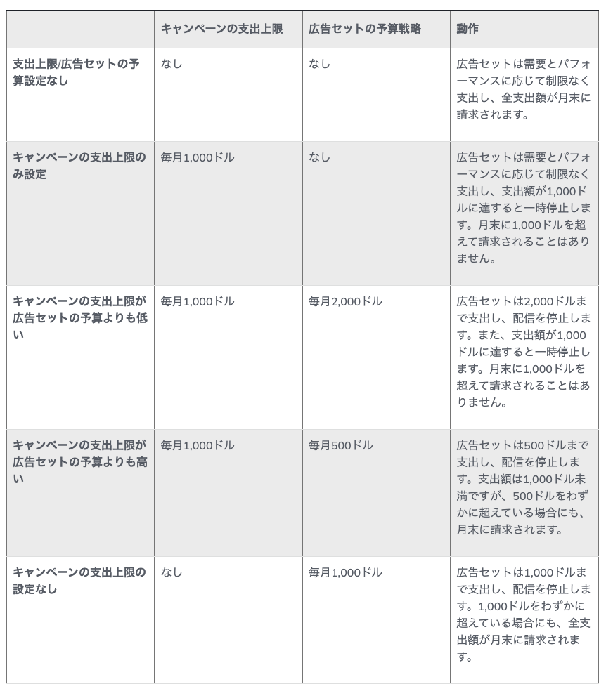広告セットを使って達成したい支出上限の目標や予算消化のペースを決定するもので、キャンペーンの広告セット間の支出戦略をより細かく指定できます。