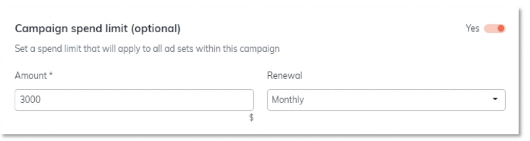 キャンペーンに支出上限を設定すると、特定の更新期間のキャンペーンの請求額に上限を設けることができます。この制限は、キャンペーン下にグループ化されたすべての広告セットに適用されます。