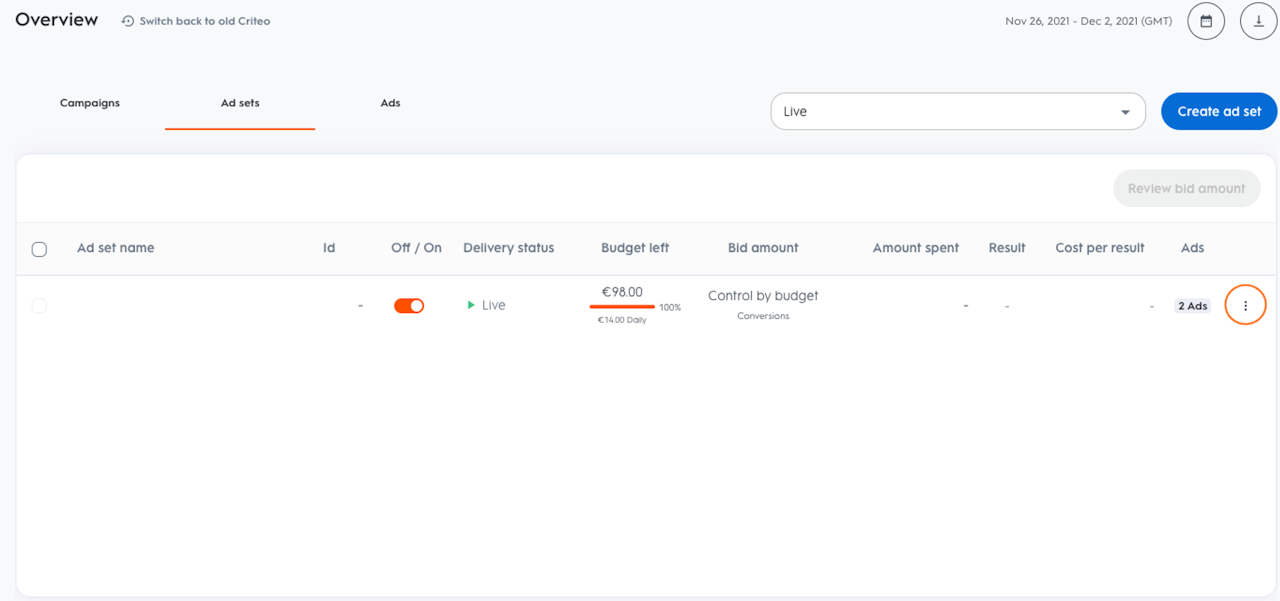 広告セットを編集する場合は、特定の広告セットの横にあるドットが3つ並んだ設定メニューのアイコンを開きます。次に、編集したい広告セットの機能を選択します。