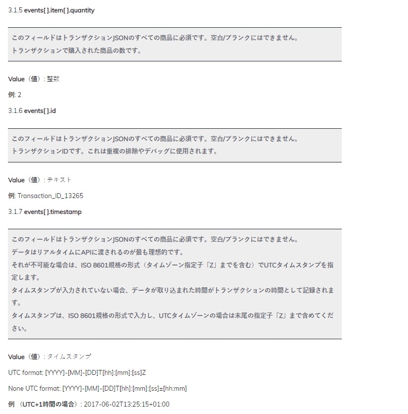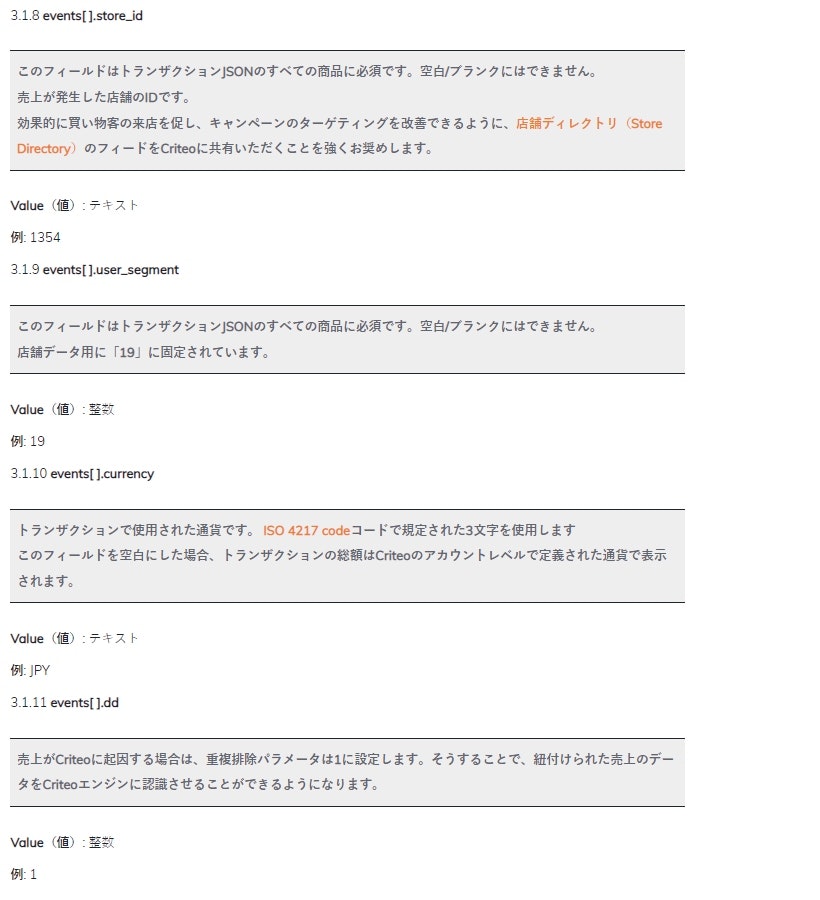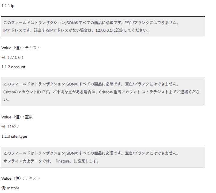 オフライン売上データをCriteoオフラインAPIに渡す際に、JSONリクエストボディに入力が必要な一連のトランザクションデータ パラメータについては、以下を参照ください。