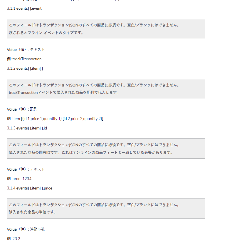 オフライン売上データをCriteoオフラインAPIに渡す際に、JSONリクエストボディに入力が必要な一連のトランザクションデータ パラメータについては、以下を参照ください。