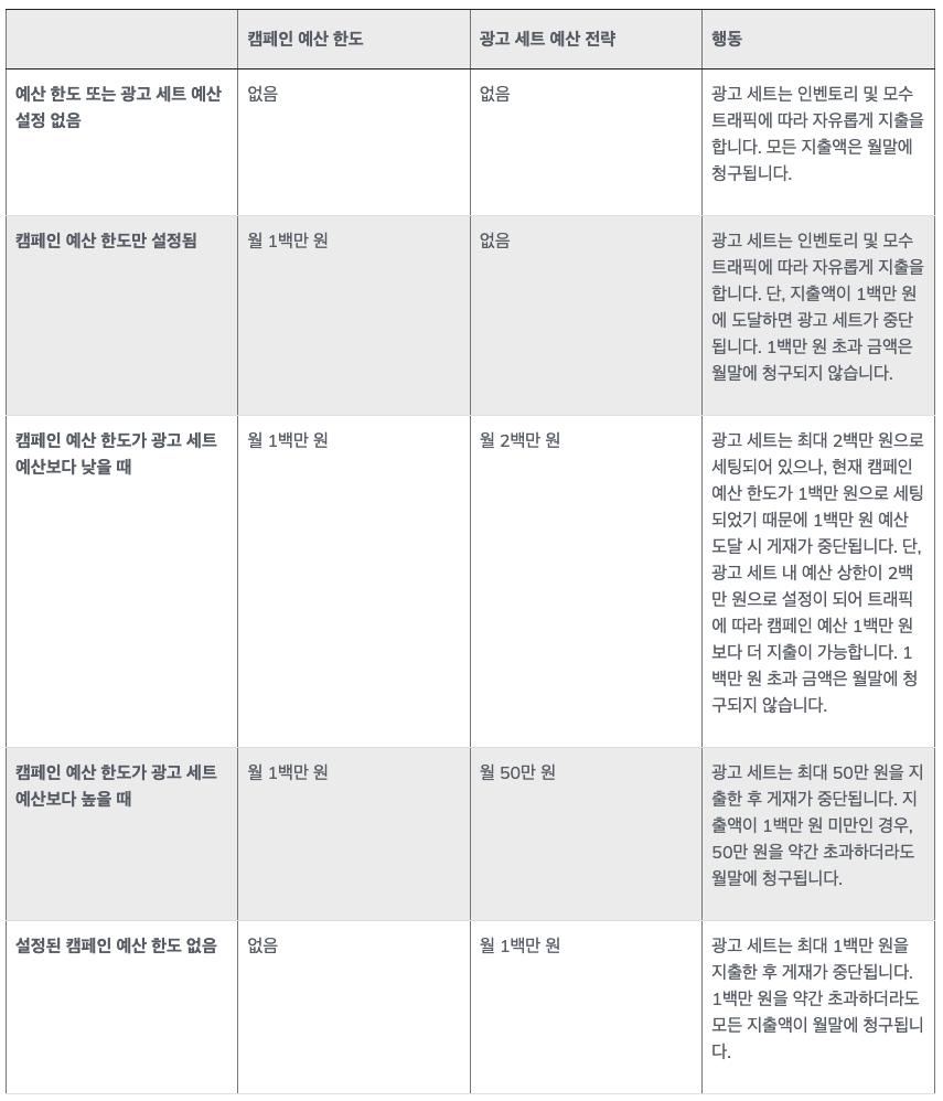 캠페인 예산이 광고 전체 최대 예산 한도 및 갱신 기간을 결정하며 해당 금액이 청구 됩니다. 만약 예산 소진에 예민한 경우 캠페인 예산 한도를 반드시 설정 하세요.