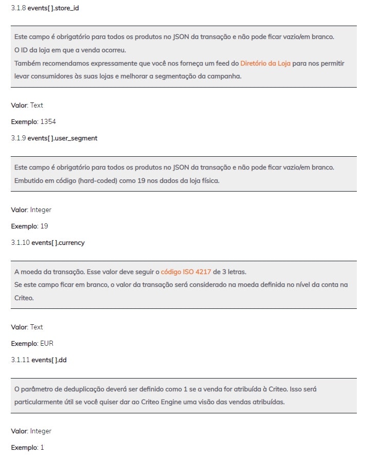 Confira a seguir o conjunto de parâmetros de dados das transações que devem ser especificados no corpo da solicitação JSON para passar seus dados de vendas offline à Criteo Offline API.