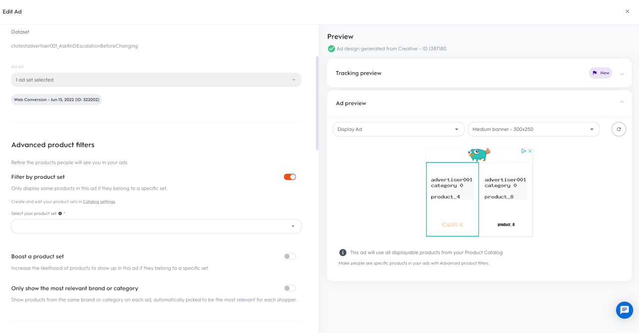 Ao filtrar por conjunto de produtos, apenas os produtos que pertencem a esse conjunto de produtos são exibidos no anúncio.